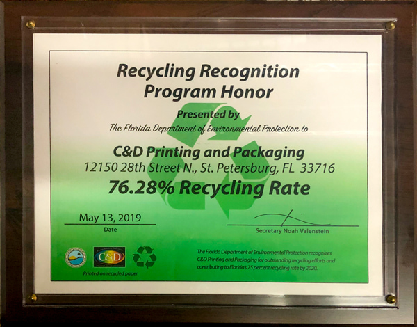 As mother nature’s favorite commercial printer, C&D Printing and Packaging was awarded with Florida’s first sheet-fed, environmentally friendly commercial printing certification. Our digital and offset presses are among the cleanest production processes available. At C&D, our extensive recycling and chemical-free processes have earned us multiple awards and recognitions. With a 76% Recycling Rate, C&D is at the forefront of our industry in clean manufacturing practices.